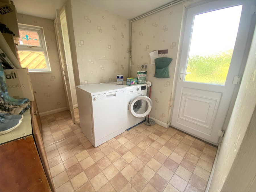 Having a door leading out to the rear garden, a window side facing, plumbing for a washing machine, storage cupboards, doors into the garage and the guest cloaks and a ceiling light.
